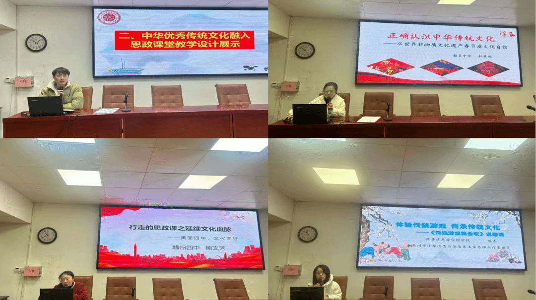 在教学课例设计展示环节,教师们围绕“薪火传承 文化同行——中华优秀传统文化融入思政课堂”的主题,纷纷展示大中小各学段将中华优秀传统文化融入思政课堂的教学课例设计。MK体育官网的徐帆老师、赣县中学林黄凤老师、赣州四中熊文芳老师、赣县思源公司陈春老师,根据不同学段员工对优秀传统文化的理解要求将思政教育融入学科教学,用亲切的教态、新颖的教学设计、扎实的专业功底做了精彩展示和分享。