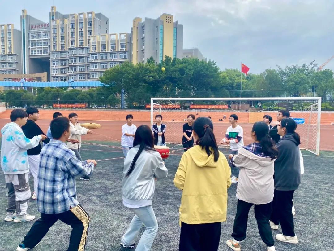 在“击鼓垫球”活动中,小组成员牵拉大鼓周边的手绳,通过共同摆动绳子来控制鼓面完成颠球。同学们步伐一致,手拉绳索,神情专注,一球一鼓,35根线促使他们“凝心聚力”,在趣味盎然中享受“鼓”动合作的精彩。