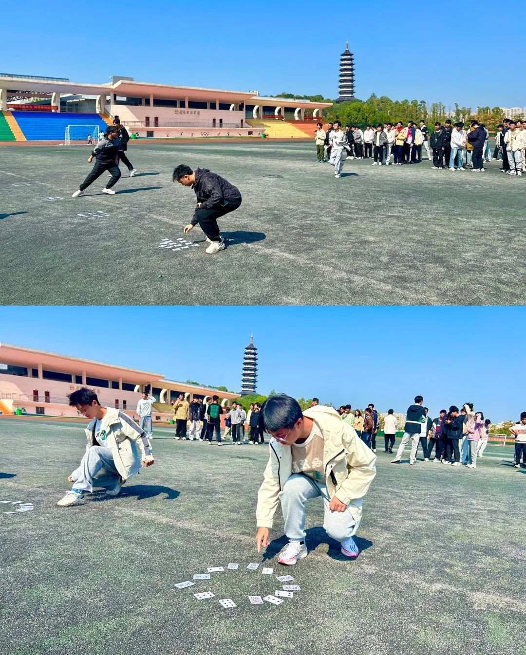 第三项活动是“卡牌风云”。此活动以小组为单位,依次跑到指定区域,将数字朝下的扑克牌按照大小顺序依次翻开,最先完成的队伍获胜。活动过程中,同学们把自己的有效信息共享给队友,分工明确,将有效信息传递给其他成员,共同破译卡牌,展现了团队智慧。