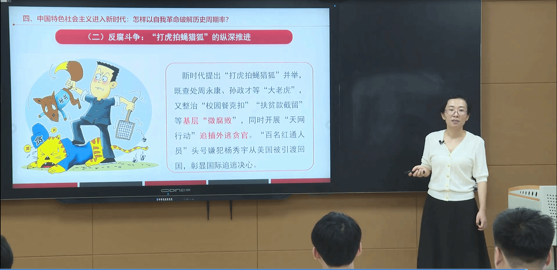 孙聃老师接续讲解其余内容:社会主义革命和建设时期,以“三反”运动、刘少奇调研及雷锋、焦裕禄事迹,展现执政后拒腐防变实践;改革开放和社会主义现代化建设新时期,围绕制度反腐与教育实践,并结合陈希同、成克杰案说明党反腐的坚定立场,还通过师生互动探讨了反腐从“运动式”转向“制度化”的原因,说明应对市场经济考验的举措;中国特色社会主义进入新时代部分,详解中央八项规定、“打虎拍蝇猎狐”及作风建设常态长效机制,介绍了相关案例,强调作风建设永远在路上。