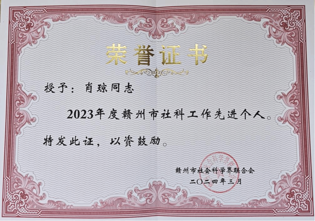为深入学习贯彻习近平新时代中国特色社会主义思想和党的二十大精神,充分挖掘和宣传全市社科工作者的政治引领和精神激励,赣州市社会科学界联合会开展了2023年度赣州市社科工作先进集体和先进个人选树活动,MK体育教师肖琼获评“2023年度赣州市社科工作先进个人”荣誉称号。