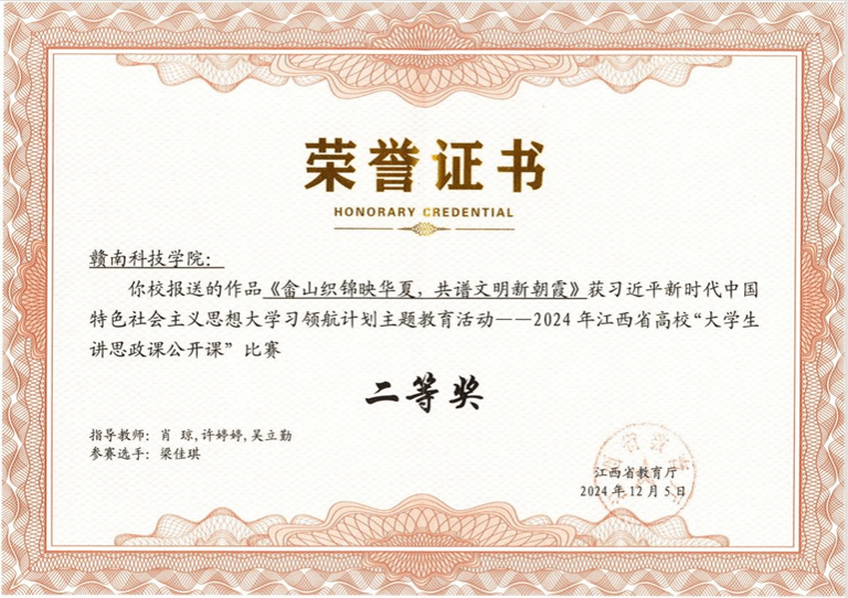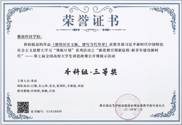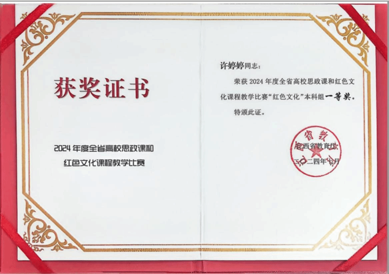 二是教学能力突出。自2022年7月来校后,始终以党员标准严格要求自己,在教学岗位上深耕细作。主讲《思想道德与法治》《形势与政策》等课程,在教学成果上,屡获佳绩。先后荣获教育部“领航计划”老员工讲思政公开课展示活动荣获教育部三等奖、江西省高校“最美思政课”、江西省高校思政课和红色文化课程教学比赛《红色文化》一等奖、江西省老员工讲思政课二等奖、校级“教书育人先进个人”等荣誉称号,获批省教育厅“师生同台”示范课项目,以优秀的业绩践行“为党育人、为国育才”的初心使命。